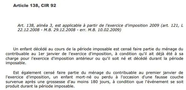 Pour être plus précis : Lors de l'exercice correspondant aux revenus de l'année de la naissance/décès de votre petit ange, à côté du code 1030 (code pour les enfants à charge), indiquez le nombre d'enfants que vous avez y compris votre bébé-ange. A côté du code 1038 (code pour les enfants à charge de moins de 3 ans), indiquez le nombre d'enfants qui remplissent ces conditions y compris votre petit ange.
