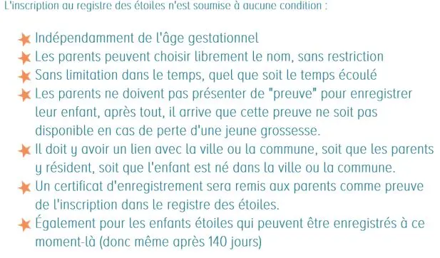 Le registre des étoiles est un registre qui permet d’enregistrer symboliquement l’existence de nos précieuses étoiles auprès des instances locales, là où, en Belgique, légalement, c’est encore chose impossible puisque c' est entre autres lié à un âge gestationnel. Près de la moitié de la Wallonie s’est dotée d’un registre des étoiles symbolique. Aujourd’hui, déjà 152 villes et communes wallonnes se sont d’ores et déjà engagées à ouvrir ce registre.