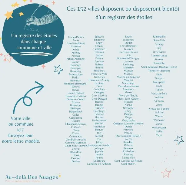 Si vous aussi, vous souhaitez que votre ville ou commune ouvre ce registre des étoiles symbolique, vous pouvez adapter la lettre ci-jointe expliquant cette démarche et l’importance de celle-ci. Modèle de lettre (ici) proposée par Au-delà Des Nuages sur ce post : ici.